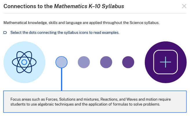 This activity shows how the Science 7–10 syllabus connects to other subjects. Users select the buttons labelled with subject names to see specific examples of the connections. I used the icons from the syllabus diagrams on the NSW Curriculum website for each subject.