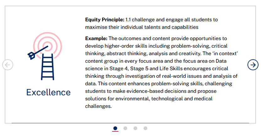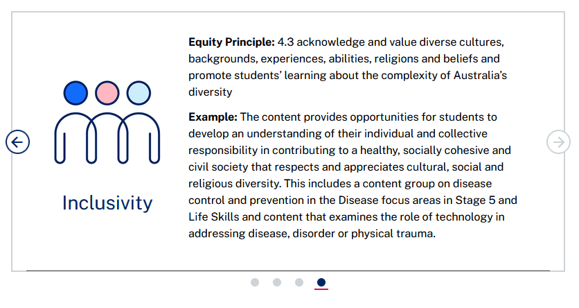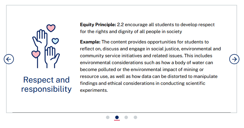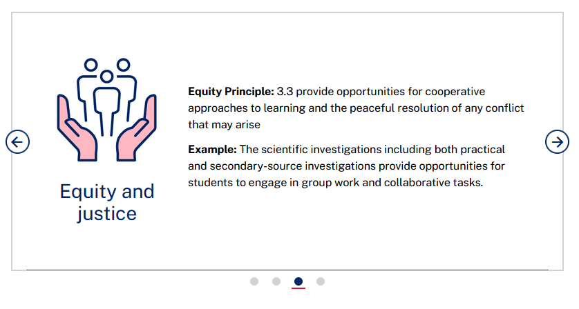 I created this carousel with examples of how NESA’s equity principles are incorporated in the Science 7–10 syllabus directly in Canvas using the html editor. I used the interactive carousel template that had been added to the Canvas CSS for our team, and created the layout of the slides using Flex containers. The icons I used are from other NESA media about the equity principles.
